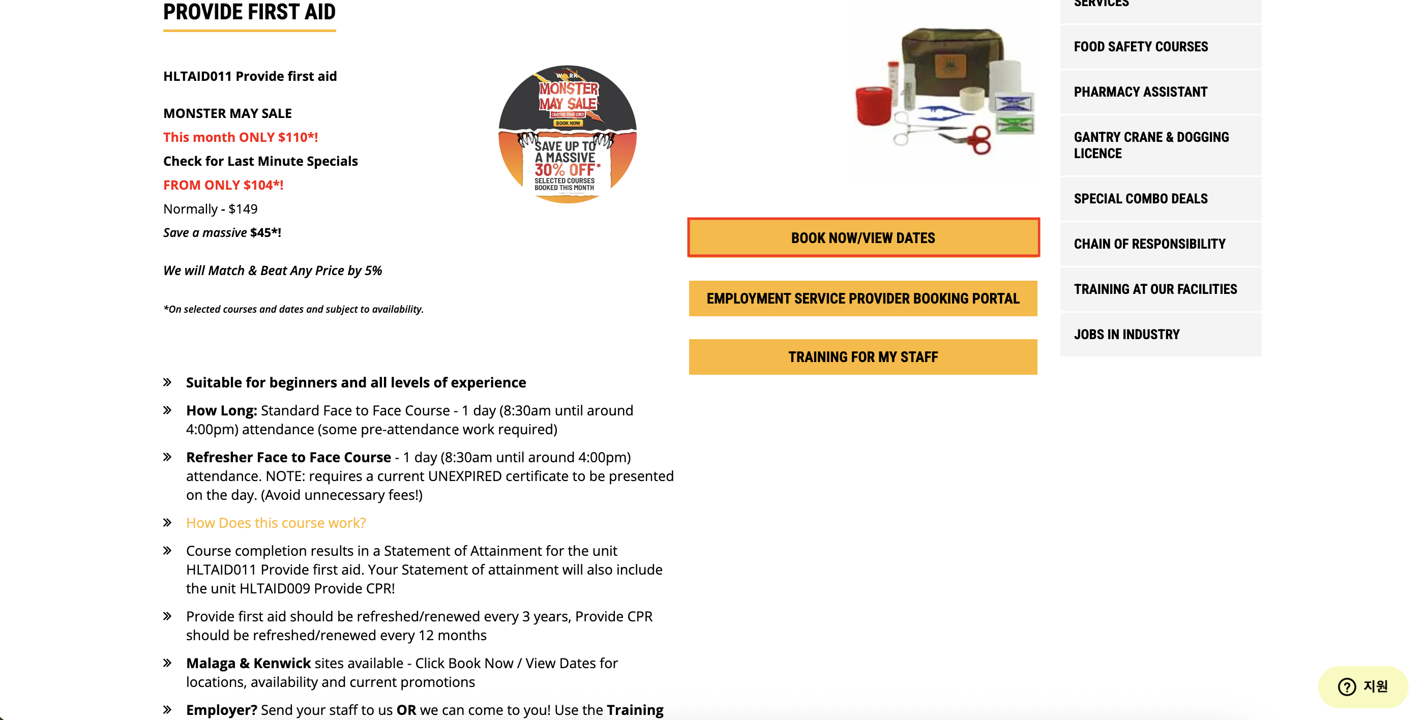 자격증은 반드시 RTO (Registered Training Organisation) 라는 정부 등록 교육기관을 통해 발급받아야 합니다. 구글에서 First Aid course near me 또는 First Aid training in Perth처럼 검색하면 근처 RTO 목록을 확인할 수 있습니다.