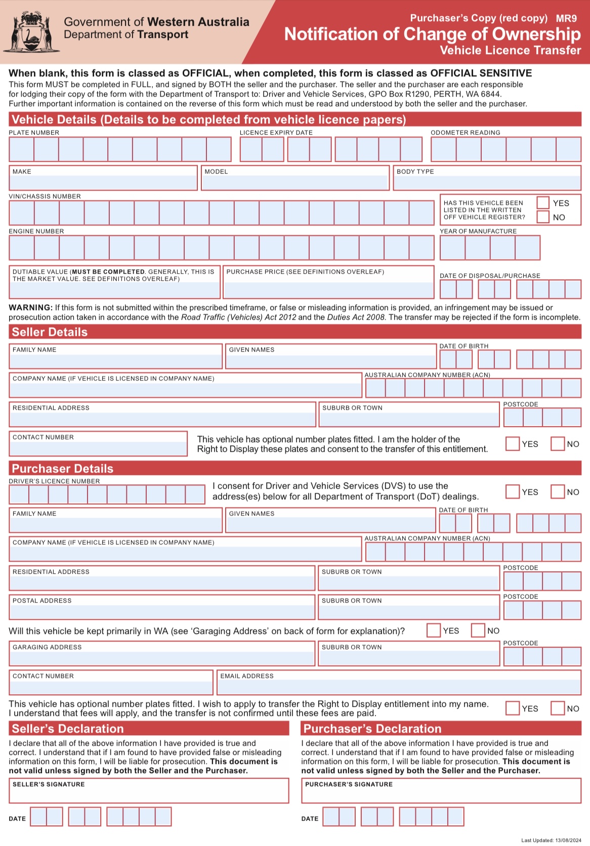 서호주(Western Australia, WA)에서는 중고차를 구매한 이후, 판매자는 7일 이내, 구매자는 14일 이내에 차량 명의이전을 신고해야 합니다. 이 기한을 초과할 경우, 벌금이 부과될 수 있으며, 차량이 여전히 이전 소유자의 명의로 등록된 상태라면 과태료, 범칙금, 심지어 사고 발생 시 법적 책임 문제까지 이어질 수 있습니다.
