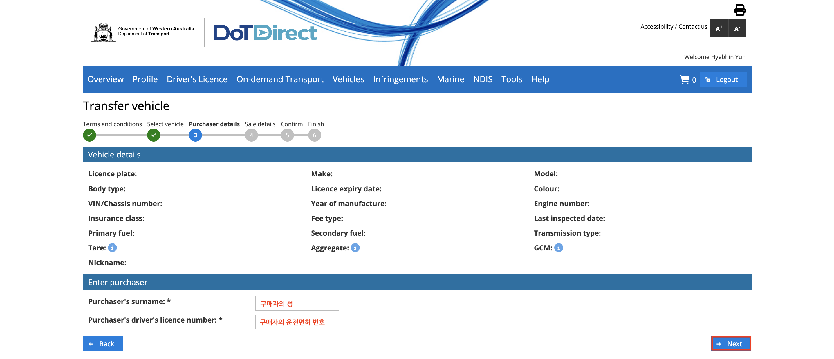 ![]() 구매자의 성(이름)과 구매자의 운전면허 번호 입력하고 'Next' 클릭 |