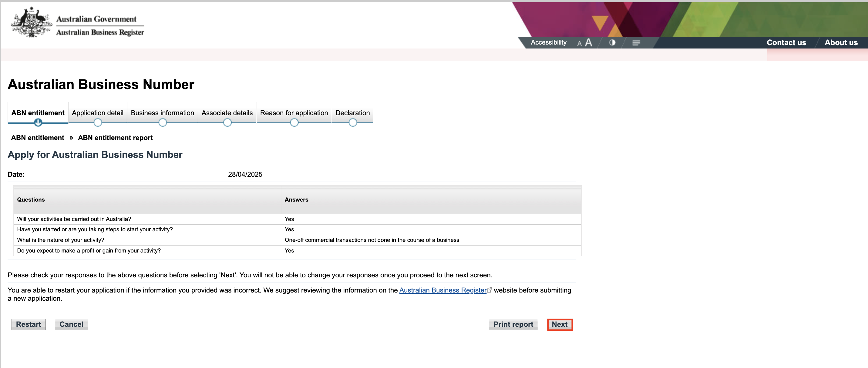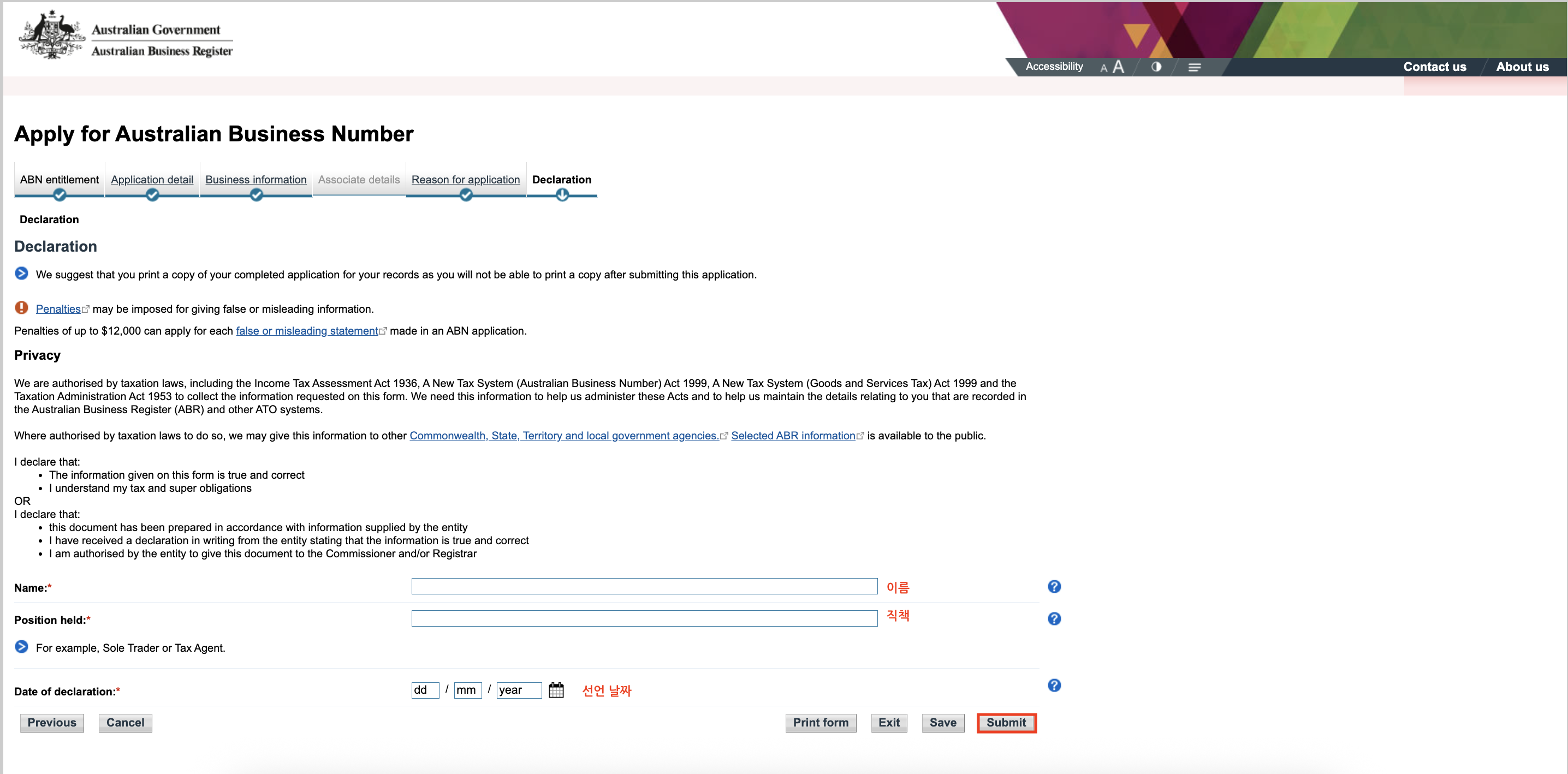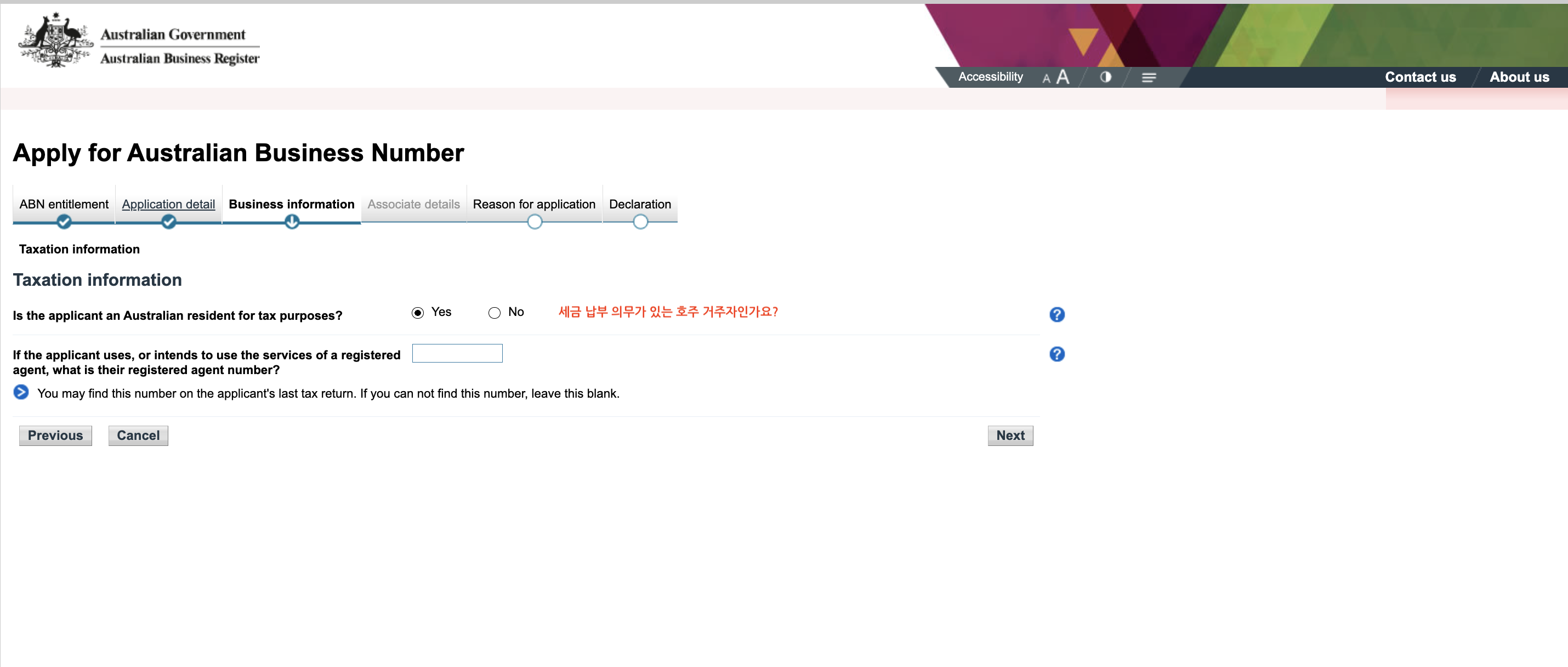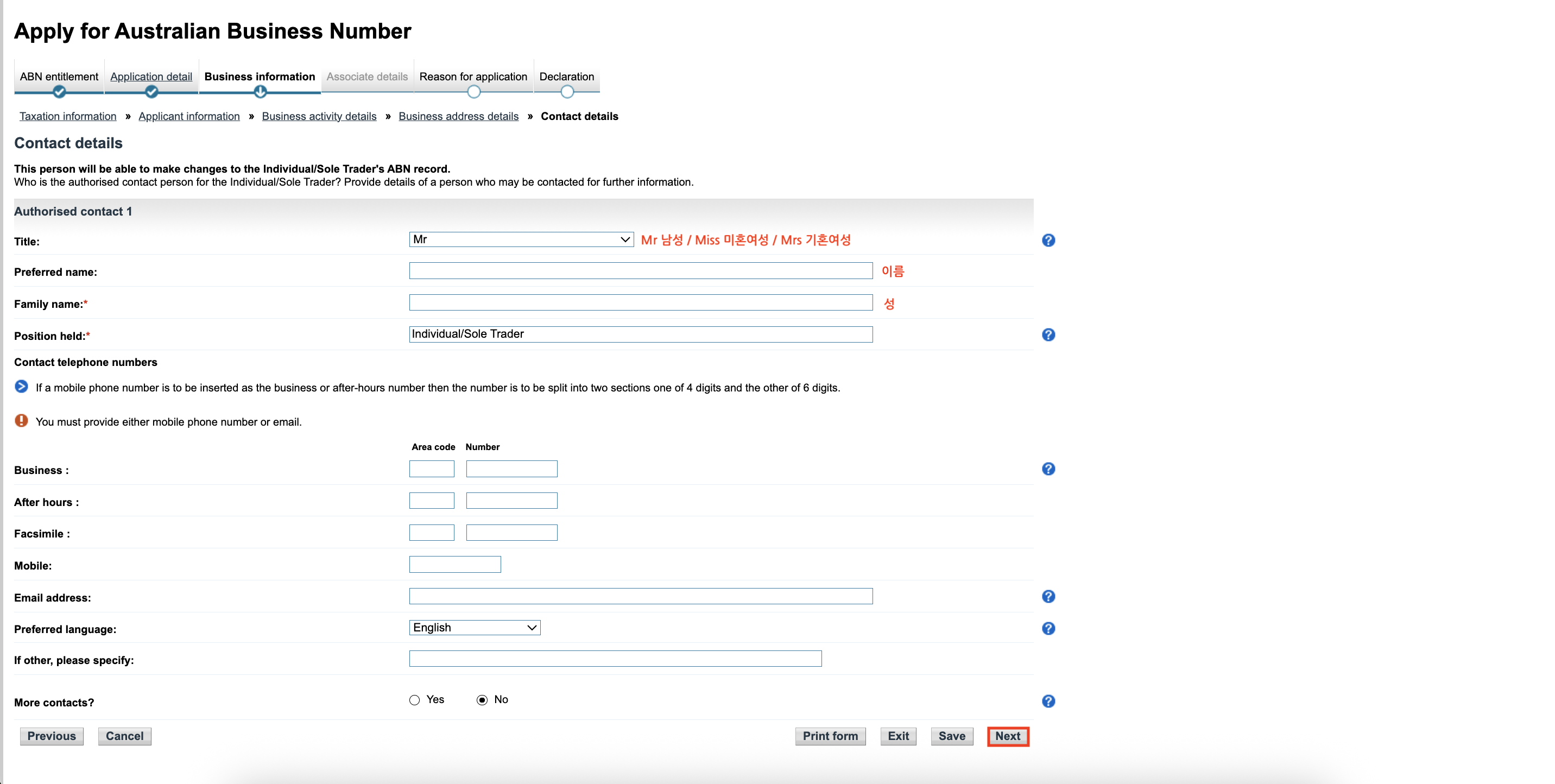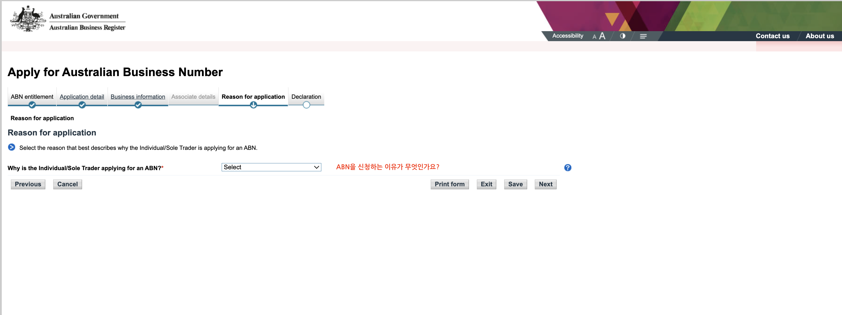 ![]() 'Why is the Individual/Sole Trader applying for an ABN'에는 'New Business in Australia'를 선택하는 것이 보편적입니다. |