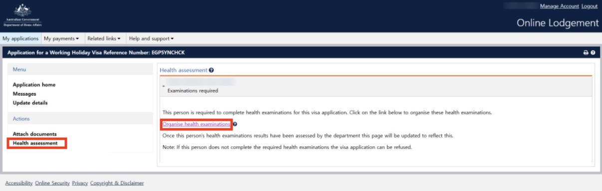 왼쪽 메뉴 중 'Health assessment' 클릭 > 'Organise health examinations' 클릭