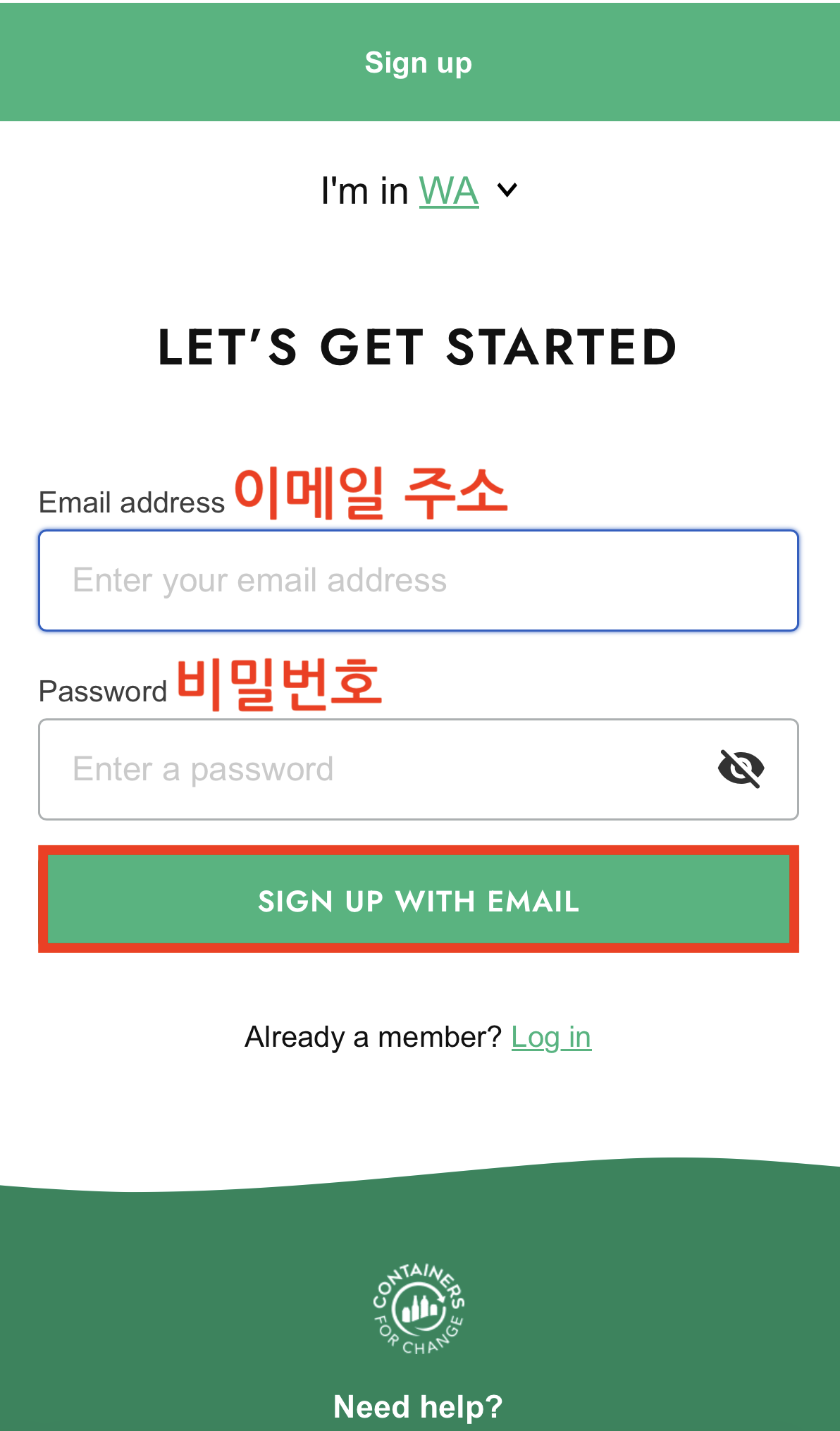 ![]() 4. '이메일 주소' 입력 → '비밀번호' 입력 → 'Sign Up With Email' 클릭 |