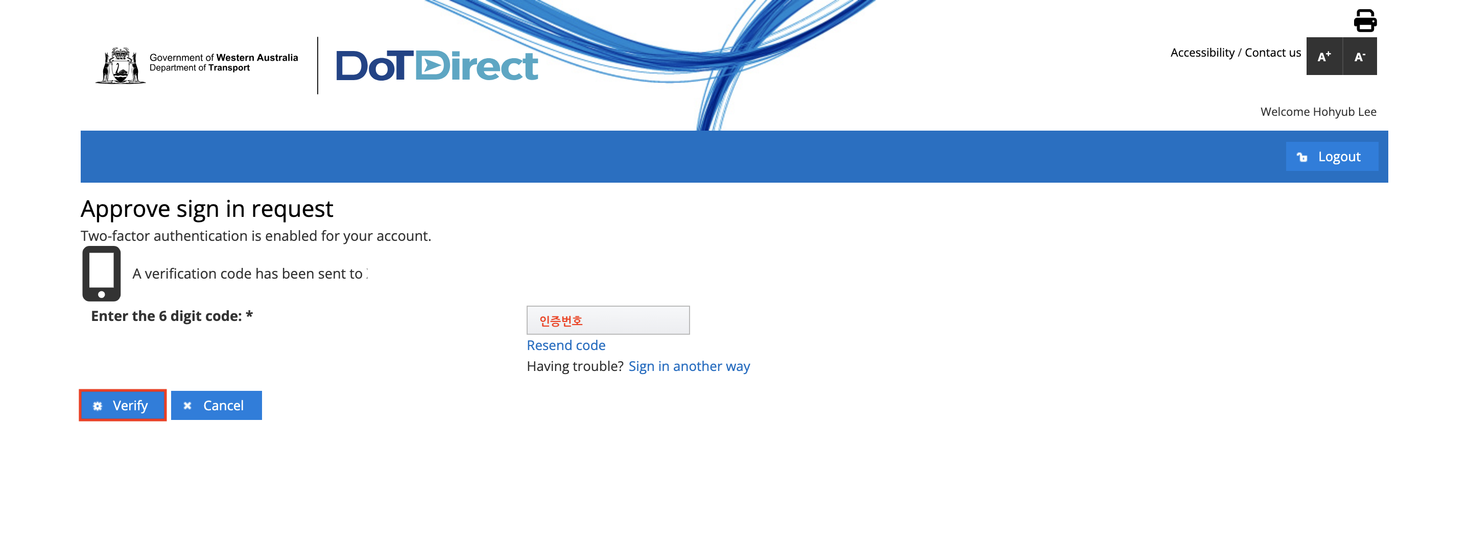 ![]() 휴대폰으로 전송된 'Code(인증번호) 입력' → 'Verify' 클릭 |