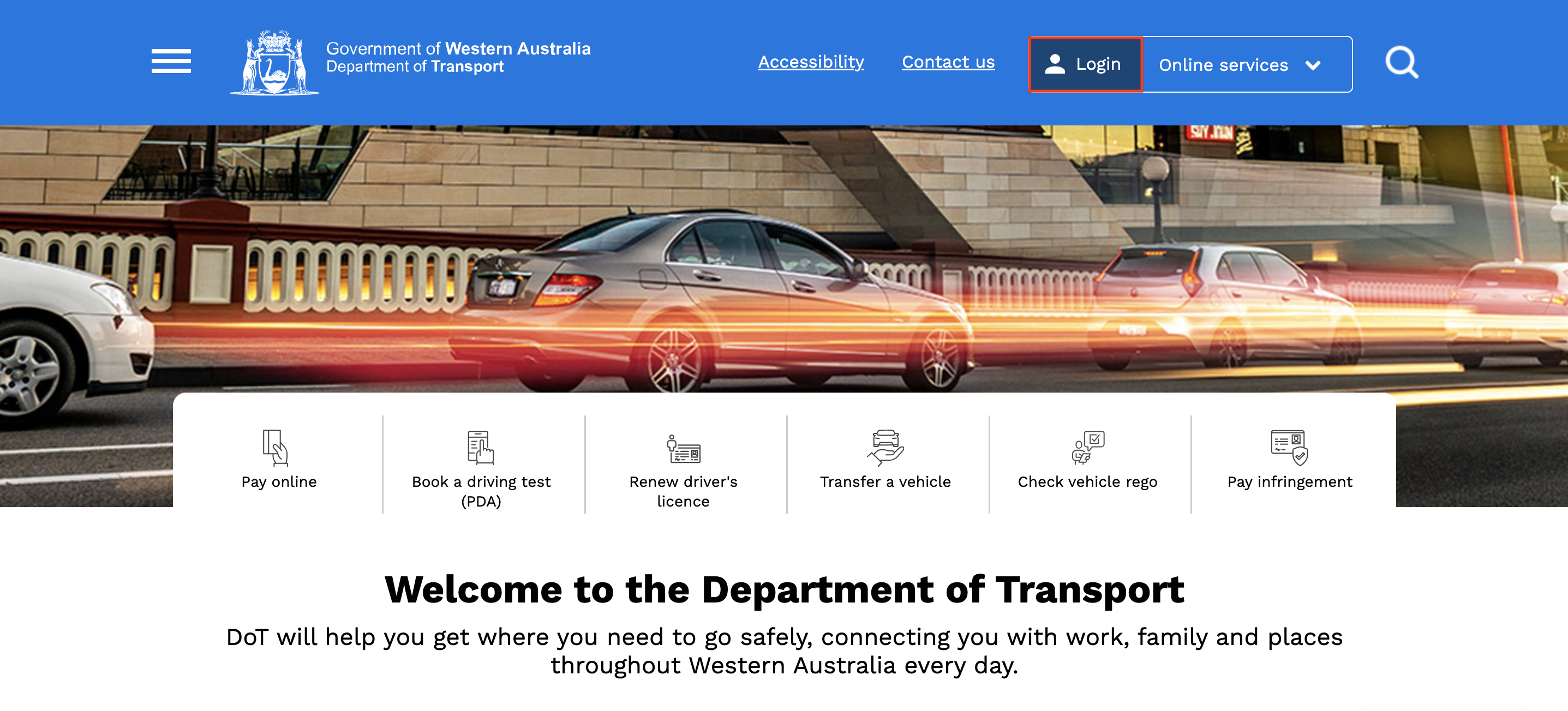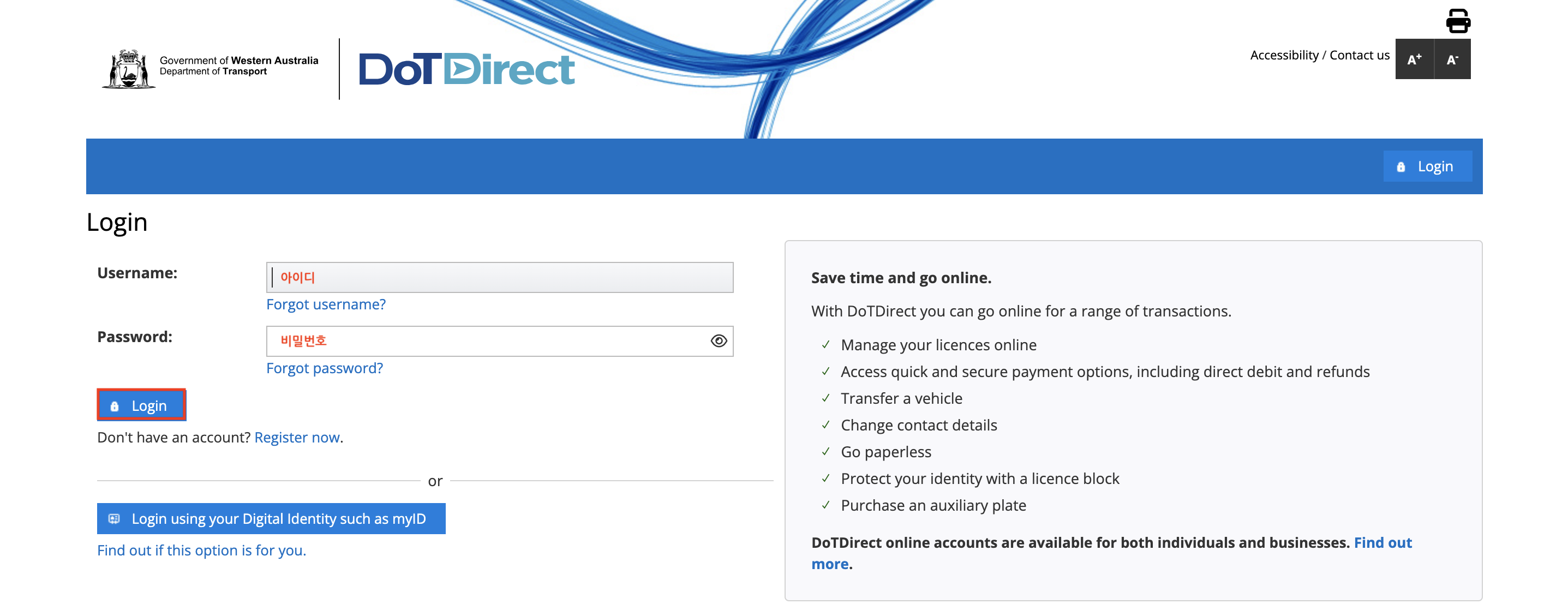 ![]() 1. DOT(Department of Transport) 홈페이지 접속 : https://www.transport.wa.gov.au 2. 우측 상단 'Login' 클릭 |