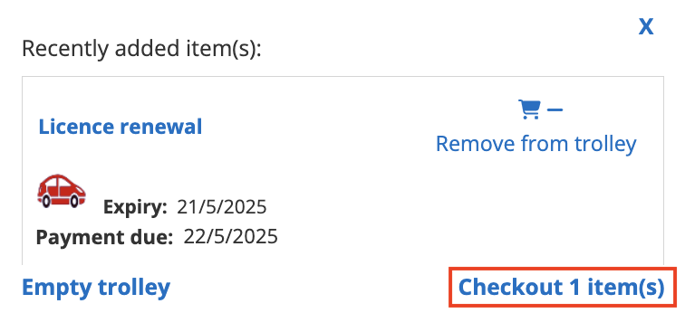 ![]() 차량번호 확인 후 'Checkout 1 item(s)' 클릭 |