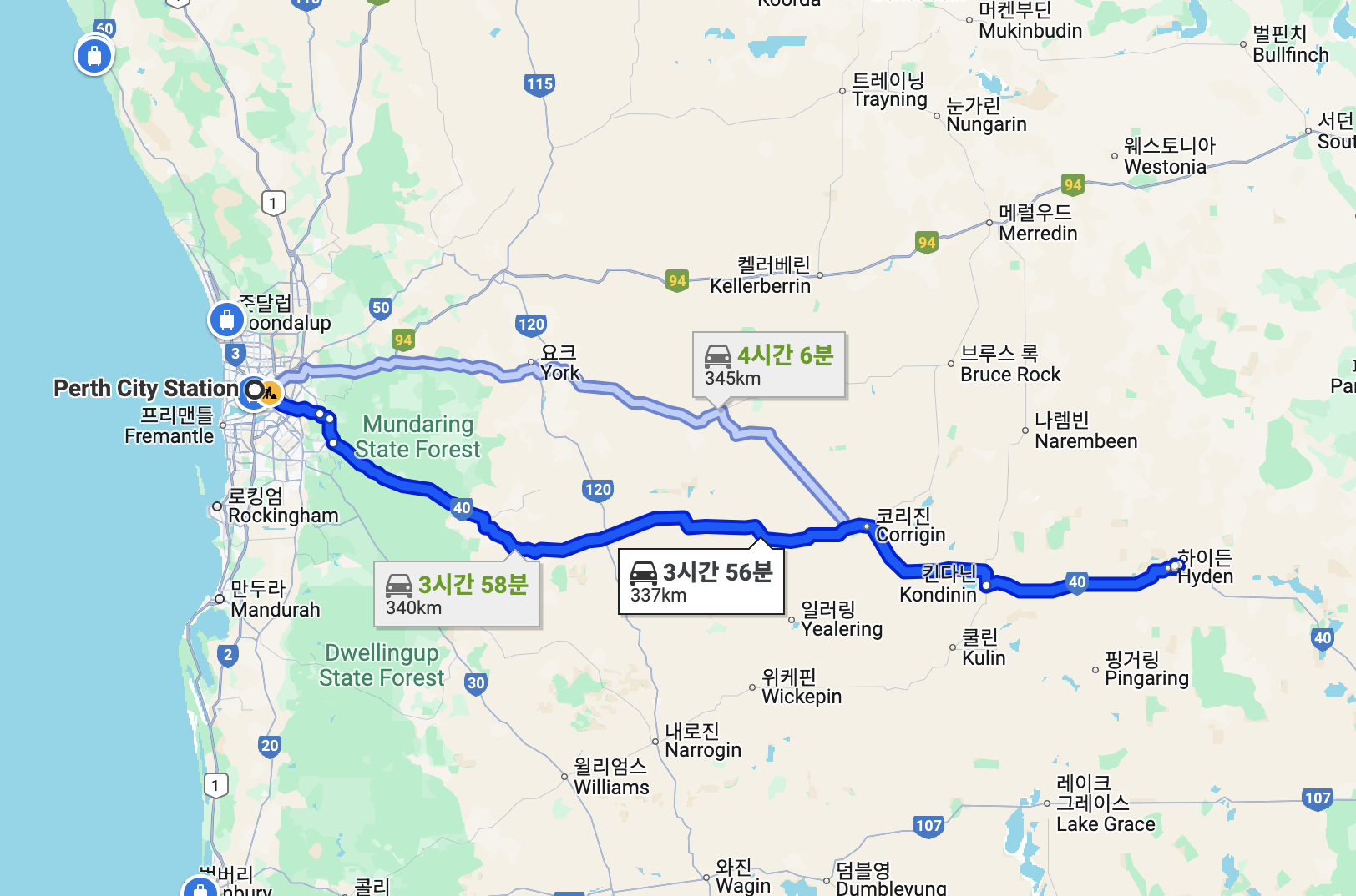 - 🚗 퍼스 시티에서 동쪽으로 편도 약 340km (차로 약 4시간 거리)